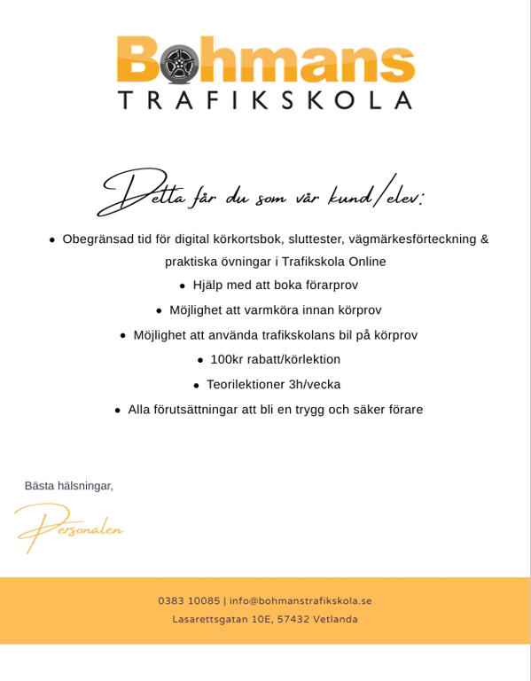 Trafikverkets avgifter - exempelvis kunskapsprov, körprov, fotografering samt tillverkning av körkort ingår ej i våra priser